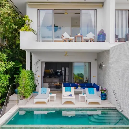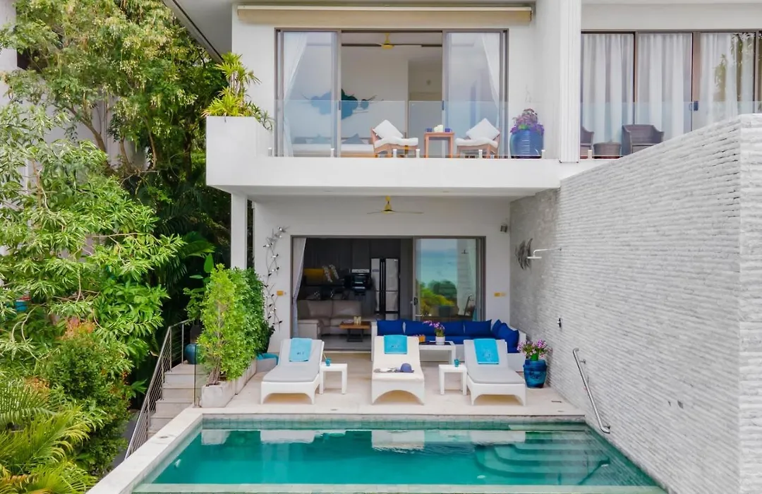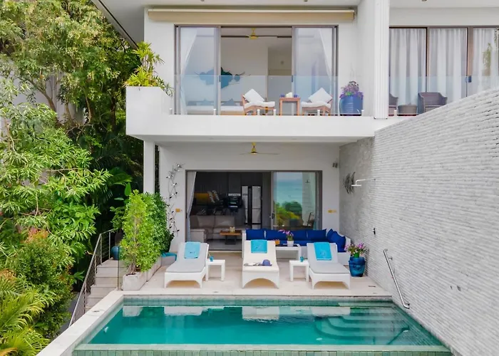 Die Shades Of Blue - Modern Sea View 4 Bed Pool Villa Ko Samui liegt in einer Entfernung von 5 Minuten zu Fuß vom Samrong Beach und bietet Annehmlichkeiten wie WLAN und Parkplätze. Die Villa befindet sich in 2 km Entfernung vom Großen Buddha und überzeugt Gäste mit einem Jacuzzi .